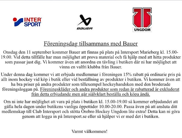 Om ni inte har möjlighet att vara på plats i butiken kl. 15.00-19.00 så kommer erbjudandet att gälla hela dagen under butikens vanliga öppettider 10.00-20.00. Passa även på att ansluta ditt medlemskap till Club Intersport och stötta Örebro Hockey Ungdom lite extra! Detta kan ni göra genom att logga in på Intersport.se eller så hjälper vi er med det i butiken.