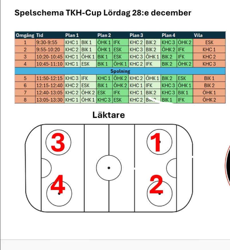 Hej! Nedan ser ni spelschema för morgondagen. Vi kommer att dela upp barnen i 2st lag på plats imorgon när vi vet vilka som är på plats. Vi lägger då upp lagen som en nyhet så att alla kan veta vilken plan barnen spelar på. Enligt första anmälan så var vi 20st barn och det är 17st som har swishat in anmälningsavgiften. Om någon vet med sig att det är missat så ber vi er att betala in så fort som möjligt. Som ni ser på schemat så är det tätt med matcher och det kan vara bra att packa med något mellanmål. Det kommer att vara en längre paus för spolning där det kommer att finnas tid att äta. Cafeterian kommer att ha öppet och det ska finnas enklare mat att köpa. Hoppas att alla är taggade för en rolig dag imorgon!